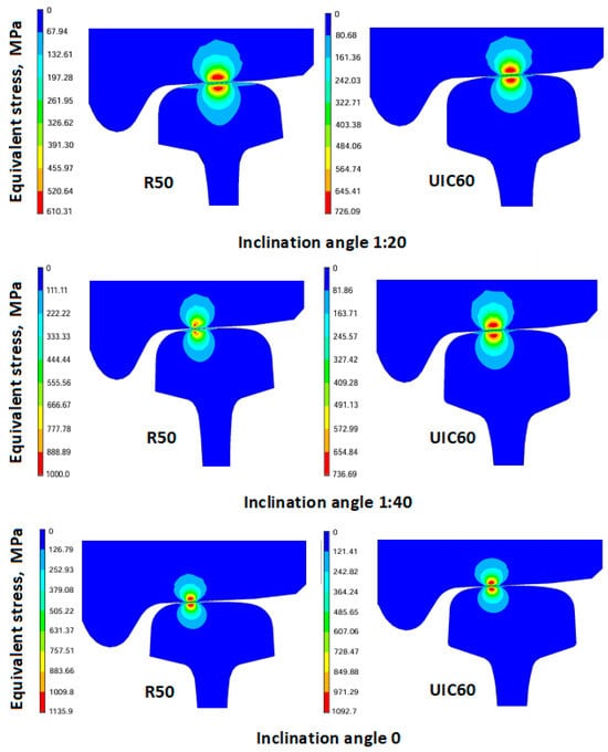 In [14], it is shown that in the case of a single-point contact of a railway wheel according to DSTU 4835:2008 [22] with rails R50, R65 according to DSTU 4344:2004 [23], the use of a 1:20 rail inclination provides minimal contact stress values ~ 600 MPa (Figure 8).