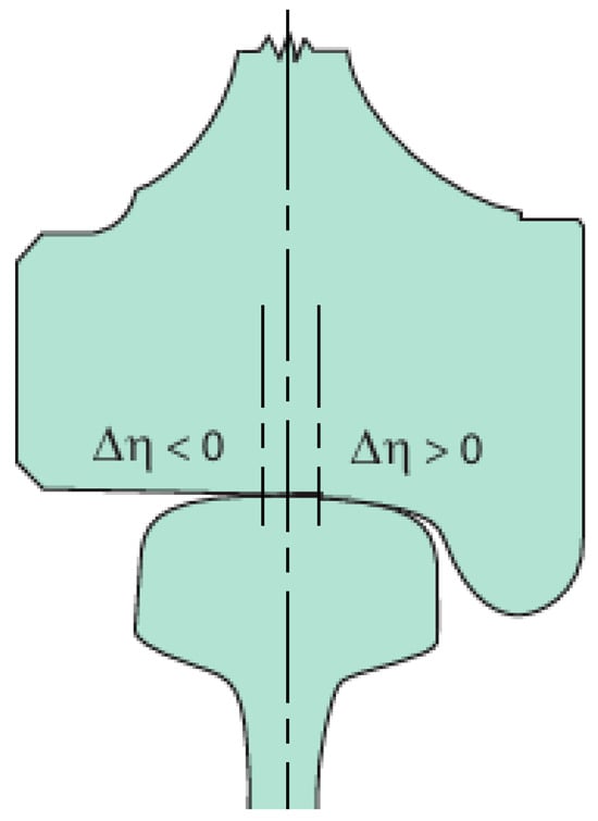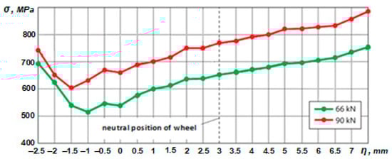 The position of the wheelset relative to the two rails in the track also affects contact stress levels, even on straight track sections. During movement, the bogie of the rolling stock undergoes transverse oscillations, leading to different combinations of wheel–rail contact zones. This results in changes in the size and shape of contact patches and, accordingly, significant variations in stress distribution. In certain cases, two-point contact with impact interaction between the flanges of the rolling stock wheels and the rails may occur. Works [41,42] present the results of mathematical modeling of the interaction between 60Е2 rails and wheels with S 1002 profiles. Calculations of contact stresses using the finite element method in the elastic formulation were performed for straight track sections with a rail inclination angle of 1:40 for two levels of static wheel loads: 60 and 90 kN. The possibility of lateral displacements of the wheel relative to the rail was also considered. The term “lateral displacement” refers to the distance between the symmetry axis of the rail and the plane of the wheel’s rolling circle (Figure 9). Positive values correspond to the rolling plane being to the right of the rail’s symmetry axis, while negative values indicate the lateral side of the rail approaching the wheel flange. For a nominal track gauge width of 1435 mm and a distance of 1425 mm between the inner faces of the wheelset flanges, the calculated lateral displacement is +3 mm from the neutral position of the wheelset relative to the track’s symmetry line. Lateral displacements of the wheelset relative to the track can range from +7.5 mm to −3 mm. At −3 two-point contact occurs as shown in Figure 5.