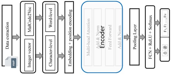 We propose a Transformer-based model for malware detection and also malware family classification, using the script code extracted from HWP files. A Transformer is a neural network architecture that introduces attention [] for sequential data. Similar to recurrent neural networks, this architecture transforms one sequence into another using an encoder and decoder. Recurrent neural networks excel at processing sequential data; their sequential computation hampers parallelization, which becomes critical for longer sequence lengths []. With its self-attention mechanism, the Transformer has shown to be effective in handling sequence-based input without relying on recursion. The attention mechanism learns internal dependencies by calculating correlation values of internal features within the script codes. This enables the identification of the main patterns through the weighted average of feature representations. We exclusively use the encoder part of the Transformer to generate representations containing information, determined by the attention of the input sequence. In addition to the Transformer layer, the model also features a feed-forward network, a pooling layer, and two fully connected layers, as depicted in Figure 4.