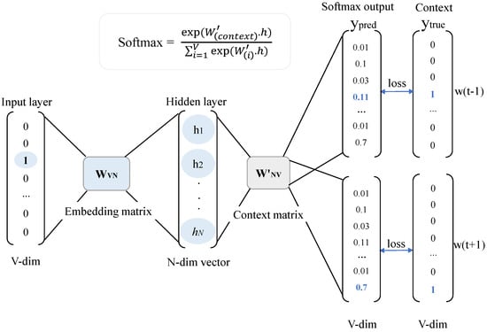 The skip-gram model is the inverse of CBoW; it predicts surrounding words given the target word. The skip-gram model excels at capturing semantic relationships (i.e., ‘malware’ is closer to ‘virus’), where CBoW is more proficient at learning syntactic relationships (i.e., ‘virus’ is close to ‘viruses’). Skip-gram functions efficiently with a small amount of data, even representing rare words well, whereas CBoW performs better with more frequent words. Figure 5 shows the skip-gram model. The input layer comprises a one-hot encoded vector of size V (vocabulary size), where every vector is zero except for the target word t. The random initialized input weight matrix (WVN) transforms the input into a hidden (projection) layer of an N-dimension vector. Each row of WVN represents the N-dimension vector associated with the respective word in the input layer. The output weight matrix, W’NV, serves as the embedding matrix for context words. Multiplying the output weight matrix within the hidden layer yields a dot product vector of size V. The softmax function is then applied to compute the probability distribution (score) of each unique vocabulary in V appearing in the context of t. Finally, the error is calculated between the score and the one-hot vector of the context words, and optimization is performed through backward propagation. In our study, we trained the skip-gram model with a vector length of 100 features and a window size of three.