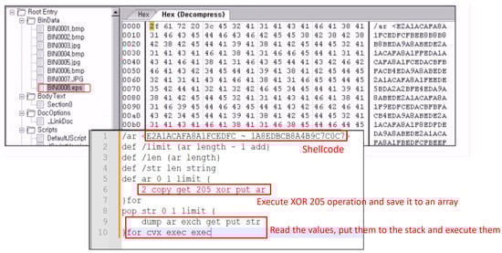 Recently, there has been a surge in document-based malicious attacks, particularly in formats such as Portable Document Format (PDF), Hangul Word Processor (HWP), Word, and Excel, posing a threat to users, including large public institutions and corporations []. The widespread use of PDF and Office files, such as Word and Excel, across various devices, makes them extremely popular choices for malware writers as playload mechanisms. The evolution of malware makes it increasingly challenging to detect and understand its inner workings. While basic security measures like virus scanners were once effective in preventing simple attacks, modern threats employ more advanced techniques []. SonicWall Capture Advanced Threat Protection has observed a year-over-year increase in new PDF-based attacks, with PDFs now ranking among the top malicious file types []. In fact, SonicWall found nearly 9% of previously seen malware files in Office formats and over 14% in PDF files, indicating a growing prevalence of document-based attacks. During recent crises, such as the COVID-19 pandemic or the war between Russian and Ukraine, attackers have exploited opportunities to pilfer confidential information from organizations [,]. Malicious word files camouflaged as pandemic-related financial documents have been widely distributed. Document-type malware conceals a malicious code within the document itself, making it challenging to detect. If the malware has a .exe extension, the recipient will likely be suspicious. However, if it lacks an executable format, it can still be activated through tasks such as opening emails or editing documents. Consequently, document-type malware spreads by exploiting this vulnerability [].