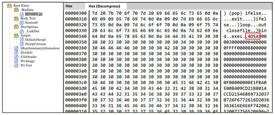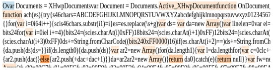Numerous malware detection models rely on bytes, OPCode (operation code) [], and application programming interface (API) call sequences [] for executable files. However, extracting a scripting code from document-type malware presents significant challenges due to its release after compilation in an executable file. Extracting scripting codes from documents can reveal insights into how the malware was constructed and operates on the victim’s system. Leveraging natural language models [,] becomes advantageous as we can extract and analyze a scripting code from document-type malware.