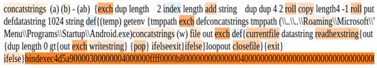 Figure 9 shows the predictions made by the Transformer model, highlighting the words that contributed the most influence on the prediction category. Notably, the EPS family malware includes string manipulation operations (exch, concatstrings, roll, copy), file operations (writestring, readhexstring, concatstrings, closefile), and a suspicious long hexadecimal string at the end (bindexec4d5a …), which is likely an encoded malicious payload. The attention mechanism highlights these operators along with ‘.exe’, underlining their significance in the prediction process.