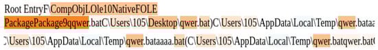 PE family malware often highlights elements such as the batch file, directory path of batch files and registries kernel.dll, and API functions. The directory path of the batch file is mentioned to add a path to the PATH environment variable of the operating system, a tactic commonly associated with exploiting the Windows operating system. Figure 10 shows the highlights on the bat file and its corresponding suspicious file path involving qwer.bat. The repetitive creation of similarly named files (Users/105/Desktop, AppData/Local/Temp) in different directories is a common malware behavior for persistence and propagation.