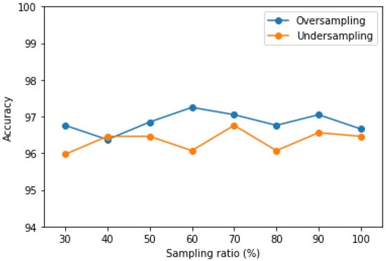Data imbalance can impact training, especially for classes with fewer samples. To investigate the impact of unbalanced data, we employed sampling methods: oversampling and undersampling [] on stream-level detection. Oversampling augments the minority samples with multiple copies, thus balancing the classes. Conversely, undersampling entails reducing the number of samples from majority classes by deleting them until a balanced distribution is achieved. We use the Transformer with word-level embedding, a model that offers the best performance. The data were sampled at levels ranging from 30% in the step of 10% until the balance was achieved. The results, shown in Figure 14, illustrate that oversampling provides more favorable solutions than undersampling. With an oversampling ratio of 60%, the model outperforms the original model by achieving an accuracy of 97.25%. As the oversampling ratio increased, the number of false negatives (FN) and false positives (FP) either decreased or remained stable within 22∼24 and 4∼14, respectively. The undersampling strategy showed little improvement for either the FN (24∼33) or FP (5∼23) rate. We believe that the sampling method has a greater effect on the importance of features, especially the undersampling, reducing the number of features, hence causing the classifier to miss useful information (patterns) that could be used in determining the decision boundary between the classes []. Generally, one can choose the best method by evaluating the performance at different levels of resampling. The overall results of the experiments conducted in this study suggest that our proposed method is the best and can effectively handle unbalanced data.