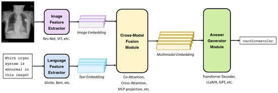 Medical Visual Question Answering (MedVQA) involves responding to questions related to medical images []. This emerging field lies at the intersection of artificial intelligence (AI) and healthcare, where machine learning models are developed to interpret and analyze medical imagery, such as X-rays, MRIs, CT scans, and pathology slides []. MedVQA aims to enhance clinical decision-making by providing accurate and contextually relevant answers to questions posed by clinicians, thereby alleviating medical professionals’ burden, reducing diagnostic errors, and ultimately improving patient outcomes [,,]. A fully developed MedVQA system can also benefit patients by integrating into online consultation platforms. It provides reliable answers in scenarios where medical professionals are unavailable, such as remote or automated health examinations. This capability helps reduce the risk of misinformation that can arise from online searches [,,]. As a significant advancement in multimodal learning, MedVQA addresses societal challenges by expanding access to high-quality healthcare and fostering informed decision-making.