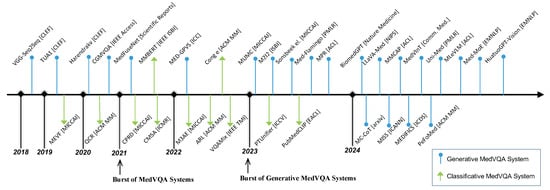 A timeline of generative MedVQA systems along with milestone discriminative MedVQA systems.