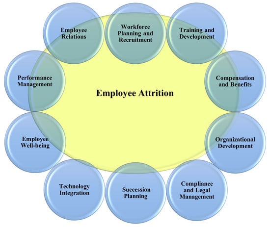 Employee attrition can pose a significant challenge to an organization’s competitive advantage, leading to a variety of negative consequences. This issue has garnered considerable attention across industries, primarily due to its detrimental impact on organizational performance, operational efficiency, and the continuity of long-term growth initiatives. Attrition can incur substantial costs, as companies must devote extra resources for hiring, and training of new staff [,]. Companies must dedicate a lot of resources and time to training each employee according to the company’s needs. When an employee leaves, not only does the organization lose valuable talent, but it also forfeits the considerable investments made in recruitment, screening, and training. Consequently, to fill vacancies, the company must once again dedicate significant resources to hiring, training, and integrating new staff members, perpetuating the cycle of cost and disruption []. Figure 1 illustrates the key aspects of human resources (HR) management and the impact of employee attrition on these areas.