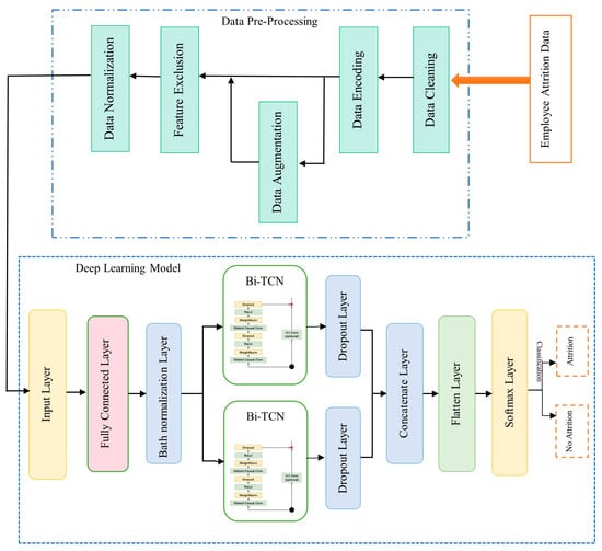 In this study, we propose a novel ensemble deep learning framework designed to predict employee attrition with high accuracy. At the heart of this framework lies the Bidirectional Temporal Convolutional Network (Bi-TCN), which excels in capturing complex correlations within the data, significantly improving classification performance. Figure 2 illustrates a comprehensive overview of the proposed methodology and model architecture.