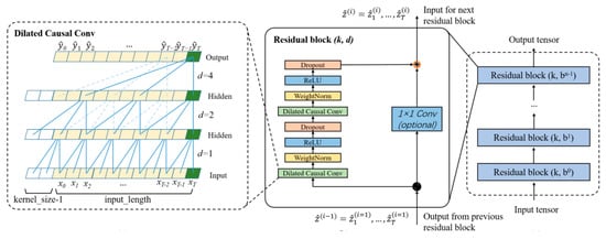Temporal Convolutional Network (TCN): One notable advancement in deep learning architectures is the Temporal Convolutional Network (TCN) [], which excels at analyzing temporal patterns while retaining the robust feature extraction capabilities of Convolutional Neural Networks (CNNs). TCN is characterized by two key features: (1) By using causal convolutions, it guarantees that the output at any given time step is entirely dependent on the inputs that are now and previously present, with no effect from inputs that may be added in the future. (2) Like Recurrent Neural Networks (RNNs), TCN can handle sequences of any length and generate outputs that match the input sequence in length. The typical TCN architecture comprises three main components: residual connections, dilated convolutions, and causal convolutions.