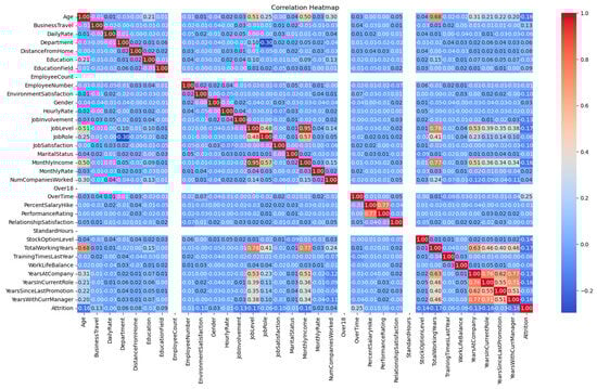 It contains 1470 records with 34 features, including attributes such as “age”, “gender”, “daily rate”, “job satisfaction”, and others, alongside a target column labeled “Attrition”. The “Attrition” column captures whether an employee has chosen to leave the company (“Yes”) or remain (“No”). Figure 4 provides a detailed visualization of the dataset’s features and their correlations.