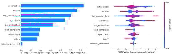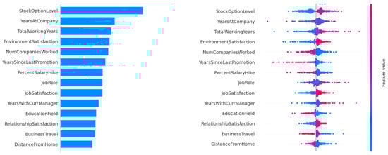 A few studies also focus on explainable AI (XAI) methods to identify the most influential features and provide valuable insights for HR decision-making. Díaz et al. [] explored how explainable AI (XAI) can be used to detect possible staff attrition and develop data-driven solutions to deal with this challenging issue. Initially, they concentrated on using machine learning models for predicting employee attrition. Then, in order to improve the transparency and interpretability of AI models, they used explainable AI (XAI) techniques like SHAP (SHapley Additive exPlanation) [], and LIME (Local Interpretable Model-agnostic Explanations) []. The authors of [] used the Explainable Graph Neural Network (GNN), and Graph Attention Network (GAT) to predict employee leave and pinpoint key variables influencing their choices. They exploited the GNN model’s capacity to identify the deep-rooted structure of employee data, where linkages between coworkers can hold significant insights. By using explainable AI methods, the model highlights the most significant factors influencing employee turnover and produces interpretable predictions. In a another study, the authors of [] introduce a novel approach to predict employee turnover by combining clustering techniques with Artificial Neural Networks (ANNs). To obtain the best ANN models, they concentrate on hyperparameter tuning with different input parameters. The study’s data segmentation helps identify important turnover predictors, which enables the implementation of focused interventions to increase the efficacy and efficiency of retention strategies. Conditional Generative Adversarial Networks (CTGANs) are used to augment data on clusters that have unbalanced data. After that, these augmented clusters are subjected to the optimized ANN models, which significantly enhances model performance. The SHAP method was utilized to assess each feature’s significance across various clusters in a predictive model. Varkiani et al. [] evaluated four machine learning models for employee attrition prediction using a real dataset obtained from an Italian financial company. They discovered that the model with the greatest performance was Random Forest. They also used the ROSE [] technique in combination with Random Forest to address the class imbalance problem because of the very unbalanced dataset. Moreover, a SHAP (SHapley Additive exPlanation) technique was used to identify feature contributions and assess their direction.