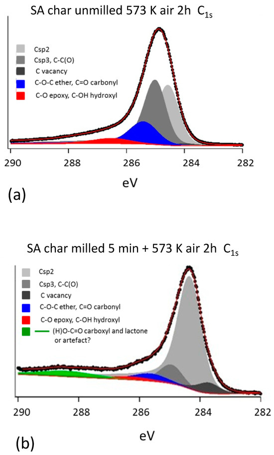 - Milled char samples have been investigated within the scope of elucidating how the exposure of metal oxides from the bulk to the surface of carbon, which is indeed enhanced by grinding, affects the characterization of the sample surfaces by XPS.
