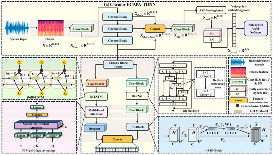 Subsequently, Yao J. [31] and others built on this by introducing a parallel branch architecture and multi-head self-attention mechanism. One branch employed the multi-head self-attention mechanism to capture long-range dependencies of speech features, while the other branch utilized the SE-Res2Block (SENet, Res2Net) module to model local multi-scale features. Different feature fusion methods were adopted to effectively integrate the feature information from both branches.