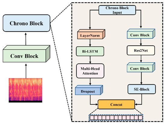 The features are then passed through three layers of the Chrono Block module, as shown in Equation (2). The Chrono Block module consists of multiple parallel branches designed to capture both global and local features, further extracting the temporal information of the speech. The output feature shape is .