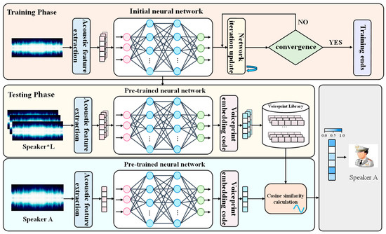 The air-ground communication speaker identification system is divided into a training phase and a testing phase, as shown in Figure 4. In the training phase, the model is pre-trained using approximately 1100 h of real annotated data to obtain a well-performing system model as the seed model. The loss function (Sub-Center Loss) is used to guide the network to update its weights, gradually reducing intra-class distances and increasing inter-class differences. The entire training process continues until the model converges, which means training stops when the loss function reaches its optimal solution.