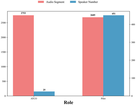 The dataset used for pretraining the model is VoxCeleb2 (Vox2), which is sourced from publicly available video resources, covering various scenarios such as interviews, news, and conversations. It contains around 1100 h of audio data from more than 6000 speakers worldwide, encompassing diverse accents, genders, and background noises. The air-ground communication dataset used in the experiments (shown in Figure 5) comes from a national key research and development program. It includes control recordings from frontline airports in southwestern China and control simulation training recordings from the Civil Aviation Flight University of China. The dataset consists of 5841 short audio segments, totaling 600 min of air-ground communication records. The audio in this dataset was collected during periods of high aircraft traffic, so it contains very few non-speech segments, with most of the audio being valid speech segments. The dataset includes both Chinese and English communication. The audio content comprises air traffic control (ATC) commands, which can be categorized into three key components: call signs, action commands, and action parameters. Call signs are composed of the airline abbreviation and flight number. Action commands refer to the specific directives within ATC communications, such as ascent, descent, or holding. Action parameters offer critical supplementary details for these directives, including speed, altitude, heading, and waypoints, all of which are vital for the accurate execution of the commands. After manual labeling, there are a total of 476 speakers in this dataset, including 25 air traffic controllers (ATCOs) and 451 pilots. After audio segmentation, there are 5438 speech segments, with 2753 belonging to air traffic controllers and 2685 belonging to pilots. The training set (ATC-Communication-train) contains 4078 audio samples from 357 speakers, while the test set (ATC-Communication-test) contains 1360 samples from 119 speakers. The speakers in the training and test sets are mutually exclusive and the speech samples are distinct.