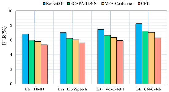 To test the generalization ability of the proposed speaker identification model across different datasets, this study selects four open-source datasets as experimental test sets, including the TIMIT dataset, LibriSpeech, VoxCeleb1, and CN-Celeb, labeled as E1, E2, E3, and E4, respectively. By testing the Equal Error Rate (EER) of different models on these datasets, the performance of ResNet34, ECAPA-TDNN, MFA-Conformer, and Chrono-ECAPA-TDNN (CET) models is compared and analyzed in cross-dataset scenarios (as shown in Figure 6). The experimental results are summarized in Table 2, which shows the EER values of each model on datasets E1 to E4, along with the average (AVG) EER value across all datasets.