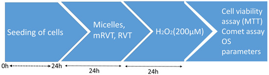 The cells were seeded in a 96- or 24-well plate in а density of 10,000 cells/well or 40,000 cells/well, respectively, and incubated for 24 h. The toxicity of empty micelles (0.2–30 μg/mL), RVT, and mRVT (1, 3, 10, or 30 μM) was evaluated via an MTT test after 24 h of incubation. For the experiments in the model of oxidative damage, the cells were pretreated with resveratrol and resveratrol-loaded micelles for 24 h in concentrations of 1, 3, 10, and 30 µM. The culture medium was replaced with medium supplemented with H2O2 (200 µM) for another 24 h. Thereafter, different assays were performed as described in Figure 1.