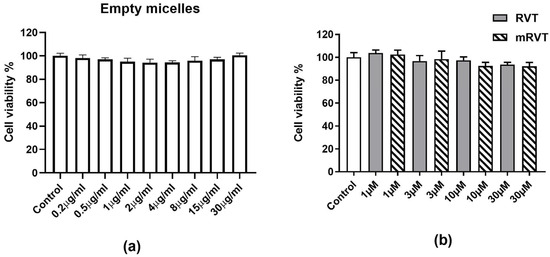 Viability of U87MG cells after 24 h of incubation with (a) empty micelles and (b) resveratrol-loaded micelles (mRVT) and pure resveratrol (RVT). Values are mean ± SEM (n = 3).