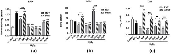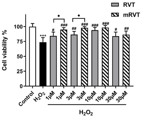 Cell viability after 24 h pre-incubation with RVT or mRVT against 200 μM H2O2-induced cell damage. Compared with the control: *** p < 0.001; compared with H2O2 group: # p < 0.05, ## p < 0.01, ### p < 0.001; compared between RVT and mRVT groups: ♦ p < 0.05.