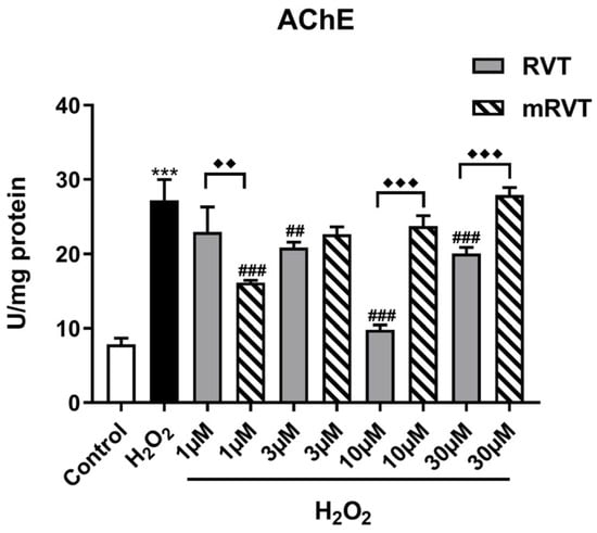 Effects of RVT and mRVT treatment on acetylcholine esterase activity in H2O2-induced oxidative stress in U87MG glioma cells. Compared with the control: *** p < 0.001; compared with the H2O2 group: ### p < 0.001, ## p < 0.01; compared between the RVT and mRVT groups: ♦♦ p < 0.01, ♦♦♦ p < 0.001.