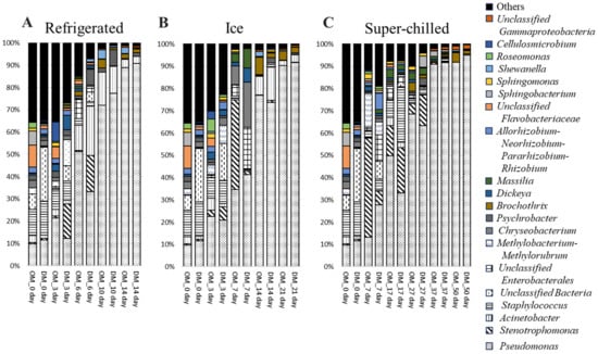 Relative abundance (%) of bacterial genera in raw yellowtail muscles during storage at different temperatures based on the classification of partial 16S rDNA sequences. OM, dorsal part of ordinary muscle; DM, dark muscle. Storage time is indicated by # day.
