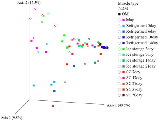 The PCoA results for the bacterial communities in OM and DM during storage at different temperatures are shown in Figure 2. The PCoA scores of the first three principal components (PCo1, PCo2, and PCo3) accounted for 40.5, 17.5, and 9.5% of the total variation, respectively. Across all storage conditions, the PCoA scores of the samples shifted rightward on the PC1 axis over the storage time, leading to the convergence of spoiled samples within a specific area. This suggests that the microbial communities in both muscle types evolved towards similar communities during storage, with the transition occurring more slowly at lower temperatures.