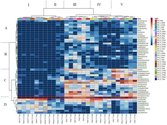 For classification at the genus levels, the “Silva 132 99% OTUs from the 515F/806R region of sequences” database was used. Hierarchical clustering analysis (HCA) heatmaps [28] of the relative abundance data for microbial genera were generated using Ward’s method in MetaboAnalyst 5.0 (https://www.metaboanalyst.ca/, (accessed on 24 February 2025) Table S2). Data were log-transformed after correcting for the second-lowest relative abundance. Fifty genera with the highest total relative abundance were selected for the analysis.