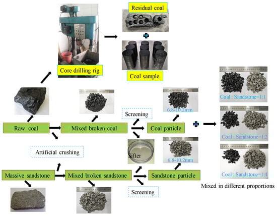 Due to limitations in the test equipment, it is impossible to fully restore the seepage process from intact coal rock samples to broken ones in the caving zone during the multi-protection mining process of the coal seam group. Therefore, a seepage test was conducted on broken coal rock bodies from the formed mining goaf using multiple cycles of loading and unloading. Since broken coal rock bodies with varying mixing ratios are found at different locations in the goaf, three coal rock samples with particle sizes of 6.8–10.2 mm and mixing ratios of 1:1, 1:2, and 1:4 were selected for the seepage test in this study. The specimen preparation process is shown in Figure 2. The specific process is as follows: First, collect the large raw coal and gangue from the working face. Next, crush the raw coal and gangue using an artificial crushing method to create a mixed crushed coal rock body with varying particle sizes. Then, screen the crushed coal rock body to obtain particles ranging from 6.8 to 10.2 mm. Finally, prepare various proportions of the crushed coal rock samples with different volume mixing ratios according to the test requirements. The basic information of the specimens is shown in Table 1.