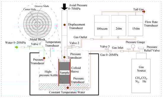 This test uses the damaged coal rock body seepage test system shown in the schematic diagram in Figure 3, as described according to Li, B. et al. (2019) [26]. The system can perform seepage tests on intact, fractured, and broken coal rock bodies under different stress paths. The seepage tests in this study were conducted following standard procedures to ensure the accuracy and reliability of the results.