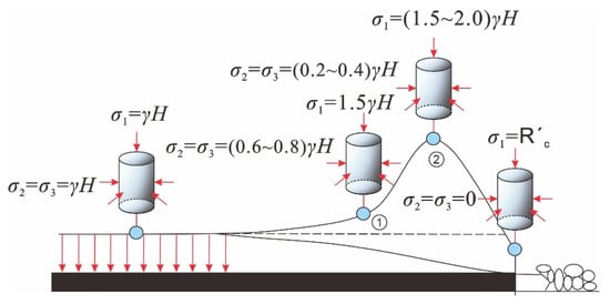Schematic diagram of the variation in horizontal and vertical stresses of the protected layer in the protective layer mining (modified from Xie et al. [36]).