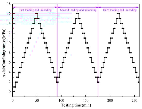Xie et al. [36] pointed out that the horizontal and vertical stresses in the protected layer vary during the mining process of the coal seam group. The horizontal stress gradually decreases from the initial hydrostatic stress to a relatively low level, remaining in an unloading state. In contrast, the vertical stress in the protected layer gradually increases from the hydrostatic stress state to peak damage and then decreases to a lower level, undergoing a loading and unloading process. Subsequently, the horizontal and vertical stresses are gradually restored to a certain level in the back-mining area by the compaction of the overlying rock layer. The changes in horizontal and vertical stresses in the protected layer after mining are shown in Figure 4. When the coal seam group undergoes multiple protection mining, mining of the back protective layer subjects the protected layer to the stress path shown in Figure 4. The intensity of this stress path depends on factors such as the mining thickness of the protective layer, the layer spacing, and the lithology of the layers. As discussed in Section 2.1, the coal rock body test in the caving zone was conducted using broken coal rock bodies from the formed mining goaf for multiple cycles of isobaric pressure plus unloading seepage tests. The test scheme is shown in Figure 5. The repeated loading and unloading seepage test under the real stress path was conducted for the coal rock body within the fracture and curve subsidence zones, as outlined in Table 3.