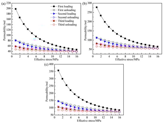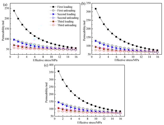 Plot of permeability versus effective stress for cyclic loading and unloading of broken coal rock samples with different mixing ratios: (a) specimen P1, (b) specimen P2, and (c) specimen P3.