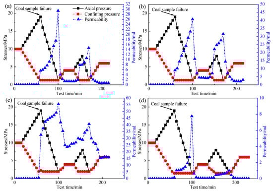 Characterization of permeability under repeated loading and unloading under the real stress path of the coal body in the fracture zone (initial hydrostatic pressure 10 MPa): (a) L1 coal sample, (b) L2 coal sample, (c) L3 coal sample, and (d) L4 coal sample.