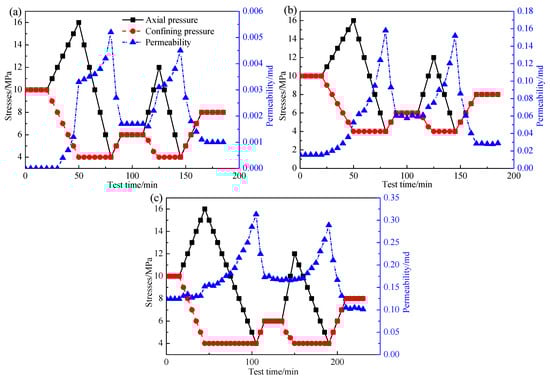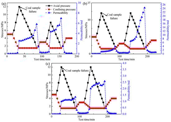 Three sets of repetitive loading and unloading seepage tests were conducted on the coal body of the protected seam in the curve subsidence zone with an initial hydrostatic pressure of 10 MPa, following the test scheme in Figure 4 and Table 3. The test results are shown in Figure 9.