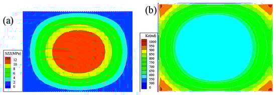 In summary, the permeability of broken coal rock bodies decreases with increasing stress, increases with larger particle sizes, and rises with a higher proportion of rock in the broken coal rock body samples. The vertical stress in the mining area generally forms an “O”-shaped distribution, as shown in Figure 11a. The broken coal rock body in the goaf is compacted by vertical pressure, with larger vertical stresses resulting in smaller particle sizes. Consequently, the particle size distribution also follows an “O”-shaped pattern, with sizes increasing from the center to the outer edges. Based on the relationships between permeability, stress, and particle size, the permeability distribution in the goaf also follows an “O”-shaped pattern, gradually increasing from the center to the outer areas, as shown in Figure 11b. Therefore, gas extraction drill holes should be positioned along the outer rim of the goaf, particularly in the four corners of it, to enhance drilling efficiency.