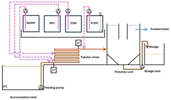 Tests were performed on a portable chemical pre-treatment device equipped with a pumping station capable of handling 1 m3·h−1; diaphragm pumps for dispensing alkali, acid, and coagulant; a tubular mixer; a flotation unit with a hydraulic capacity of 1 m3·h−1; and a storage tank for collecting separated sludge with a volume of 0.5 m3 (Figures S1 and S2). NaOH (30%) and HCl (31%) were used for adjusting the pH levels to alkaline and acidic, respectively. The sludge separation process occurred in the flotation unit, which had a volume of 1.2 m3, and involved the separation of sludge from the treated water. The processed BWW descended with gravity into the municipal sewer system. Temperature, pH, and conductivity were monitored continuously while chemical parameters were evaluated on a daily basis. The temperature in the flotation unit stayed consistently between 35 and 40 °C without the need for a heat exchanger, thanks to the elevated temperature of the BWW.