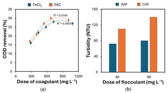 (a) COD removal as a function of the dosage of different coagulants, and (b) final turbidity of the BWW treated with PAC as a function of the dosage of different flocculants. The bars represent the 95% confidence interval of the results from diverse analyses (n = 3) made on the same sample.
