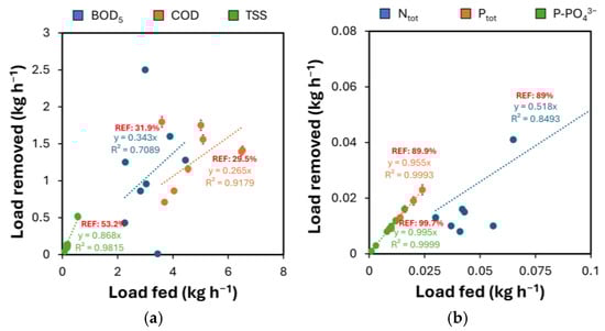 (a) Removal of BOD5, COD, and TSS, and (b) removal of Ntot, Ptot, and P-PO43− as a function of the load fed. Dotted lines refer to the linear fitting of the data. REF indicates the average percentage of removal obtained in lab-scale tests. The bars represent the 95% confidence interval of the results from diverse analyses (n = 3) made on the same sample.