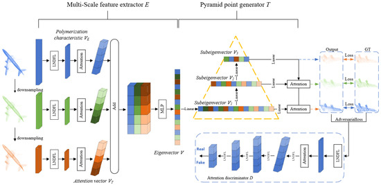 (2) Development of a Multi-Scale Attention-Based Point Cloud Generator: A point cloud generator that leverages a multi-scale attention layer and pyramid structure is introduced. This approach progressively refines local details from coarse to fine resolutions, effectively enhancing point cloud completion. When combined with a generative adversarial network (GAN), a single-scale attention discriminator is incorporated, which further boosts the completion quality of the generated point cloud.
