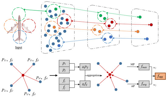 Finally, an aggregation function was used to aggregate the difference features of all neighborhood points and the central point to obtain the aggregated neighborhood feature fagg. Through max pooling and average pooling to ensure the integrity of the overall structure, the maximum value fmax and the average value favg among all the feature differences between the neighborhood points and the central point were obtained and concatenated to form the aggregated feature as the aggregated neighborhood feature fagg. Here, the weights w of max pooling and average pooling were dynamically adjusted, and , so as to improve our ability to extract local detailed features, and its calculation formula is expressed as