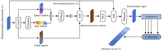 In the above formula, Wq, Wk, and Wv, respectively, represent the learnable and variable linear transformation weight matrices. Here, dm specifically refers to the dimension size of the Query matrix and the Key matrix, while dn refers to the dimension size of the Value matrix. Then, the Query matrix and the Key matrix were further calculated using the matrix dot product method to accurately calculate the attention weight matrix A. To further optimize the distribution of attention weights, the SoftMax function was applied to the elements for normalization processing, and the L1 norm was additionally used for constraint to ensure the stability and rationality of the weights. Finally, the intermediate feature Vsa was obtained, and the result of weighted summation of the Value vector by the processed attention weights is defined as follows: