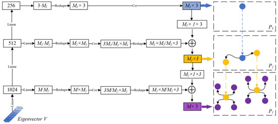 The design of the pyramid point cloud generator T combined the method of generating point clouds layer by layer in a pyramid architecture, gradually enriching the local details of the point cloud from coarse to fine to achieve point cloud completion. Specifically, the feature vector V obtained from the multi-scale feature extractor was linearly connected to obtain three feature vectors with dimensions of 1024, 512, and 256, respectively. These formed a “pyramid-style” generator to generate point clouds layer by layer. Among them, feature vectors of different dimensions performed point cloud generation operations for point cloud numbers of different resolutions. Specifically, first, V3 was used to predict and generate the current first-layer point cloud P3(M2 × 3), and then, based on V2, the second-layer point cloud, P2 was predicted and generated. In this process, the relative coordinates of the center points of P3 were further obtained through Reshape and addition operations, and the second-layer point cloud P2(M1 × 3) was generated according to these coordinates. Similarly, the completed point cloud P1(M × 3) was finally obtained. The schematic diagram of the gradual completion of the point cloud completion process from coarse to fine is shown in Figure 4.