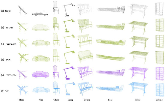 (1) When completing the local details of incomplete point clouds, LNDM-Net demonstrates a more precise ability to complete special structures. From the completion effect diagram of the Chair category in Figure 6, this chair is different from common ones as its backrest has multiple independent vertical beams. Although the original point cloud does not have a missing structure for this part, only the seat surface of the chair is incomplete. After completion, the PF-Net algorithm can effectively fill in the missing part of the seat surface. However, it mistakenly treats the vertical beams on the backrest as incomplete parts, fills the gaps between the beams with point clouds of relatively low resolution, and, at the same time, retains the special texture structure of each beam. In contrast, based on completing the seat surface of the chair, LNDM-Net treats the texture information of the chair backrest as an intact part, effectively preserves the locally fine-grained structural information that is specially retained in the incomplete point cloud, and can also identify and effectively complete the missing parts. Similarly, this situation occurs in some samples from the Lamp category. From the completion effect diagram, the input incomplete point cloud has missing structures in the lamp base and lampshade parts. The PF-Net algorithm can effectively identify the incompleteness of the base and complete it. However, when completing, it fills the curved wire between the lamp base and the support rod and the hollow structure in the middle of the support rod with low-resolution point clouds while retaining the texture information. As a result, the completed sample seems to have a complete overall structure, but it cannot effectively filter out the special texture structures in the incomplete point cloud, affecting the special structural semantic information of the local structure. In contrast, after identifying the incompleteness of the base, LNDM-Net can effectively complete it. At the same time, when facing the hollow part in the support rod and the curved wire, it can effectively determine that these are intact parts, thus maximizing the retention of local feature structures during overall sample completion.