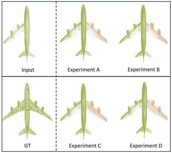 In Experiment [B], when all components of LNDM-Net were retained except for the bias-attention layer in the feature-extraction process, the average CD value increased significantly to 2.392/2.541. This change was particularly evident in the completion of the plane’s right wing. Specifically, many “floating” stray points appeared around the right wing, and the two engines of the right wing were completed in a rough and unrealistic manner. These results clearly demonstrate that the bias-attention layer allows the model to focus more on the local-detail feature information of the incomplete point cloud by adjusting the attention weights. As observed in the experimental results, when completing the plane sample, the complete and well-defined left wing served as a geometrically sensitive reference, helping the model to complete the missing right wing of the fuselage with greater accuracy and detail.