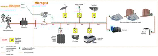 Microgrids can be defined as a group of interconnected loads and distributed energy resources (DERs) with clearly defined electrical boundaries that operate as a single controllable entity relative to the grid. They can be connected to and disconnected from the grid to enable operation in grid-connected or islanded modes. At the interface between the microgrid and the main distribution network lies the Point of Common Coupling (PCC). The connection and disconnection commands are typically issued by the Microgrid Central Controller (MGCC). There are different alternatives for implementing microgrid control systems, but the most common is the centralized approach, where the MGCC commands the PCC circuit breaker, dispatches the DERs, and manages controllable loads [1]. An example of a microgrid is shown in Figure 1.