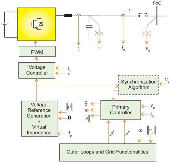 Most inverters used in photovoltaic (PV) systems and wind turbines currently operate in grid-following mode (Figure 2). This mode employs an inner current loop to ensure that the grid-side currents track their references and a synchronization algorithm to estimate the angular position and frequency of the voltage at the point of connection (PoC) [5]. Typically, the current references are generated to ensure the desired exchange of active and reactive power with the grid. For example, the active power reference may originate from the DC bus voltage outer loop, while also incorporating frequency support actions. The reactive power reference , conversely, can be derived from grid-supporting functionalities, such as voltage-reactive power characteristics or from an external signal provided by the Microgrid Control System (MGCS) [6].