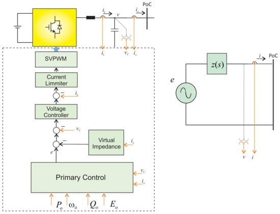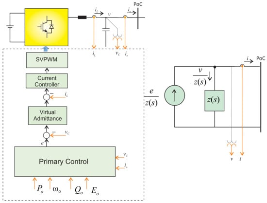 Since legacy power systems operate with inductive feeders, which have a strong relationship between active power frequency and reactive power voltage, it is reasonable to expect a trend toward the adoption of predominantly inductive virtual impedance. Furthermore, using virtual impedance in inverter-based DERs reduces the parameter sensitivity of microgrids to feeder impedance variations. Different virtual impedance implementations can be characterized, including through the Thevenin equivalent (or Theorem—Figure 4) or the Norton equivalent (Figure 5) and the relation between them [8].