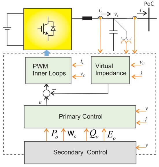 - Level 1 (primary control): The Droop control method is often used in this level to emulate physical behaviors that makes the system stable and more damped. It can include a virtual impedance control loop to emulate physical output impedance.